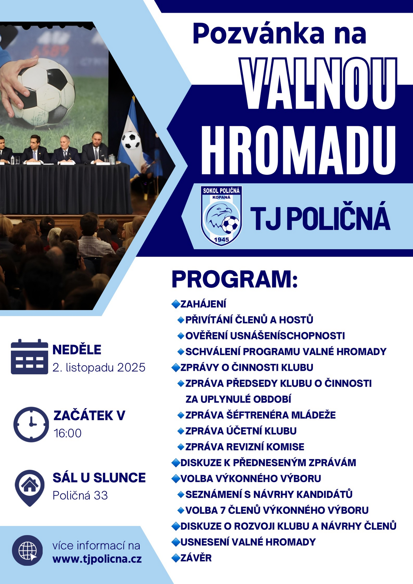 přijměte prosím pozvání na valnou hromadu TJ Poličná, která se uskuteční v neděli 2. listopadu 2025 od 16:00 hodin v hostinci U Slunce, v Poličné, na adrese Poličná 33.
